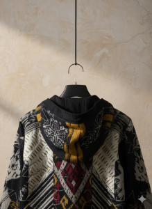 With its bold gold-and-black ikat pattern and comfy hood, this jacket adds an instant touch of character to any outfit. Perfect for layering over casual looks, it keeps you warm while standing out with its unique design. Easy to wear, easy to love.