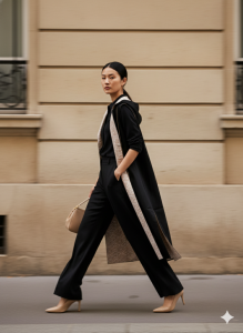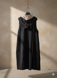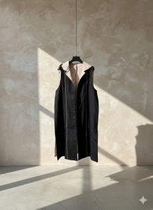 A sleeveless long coat with minimalist structure and Batik inner lining, blending effortless elegance with modern edge